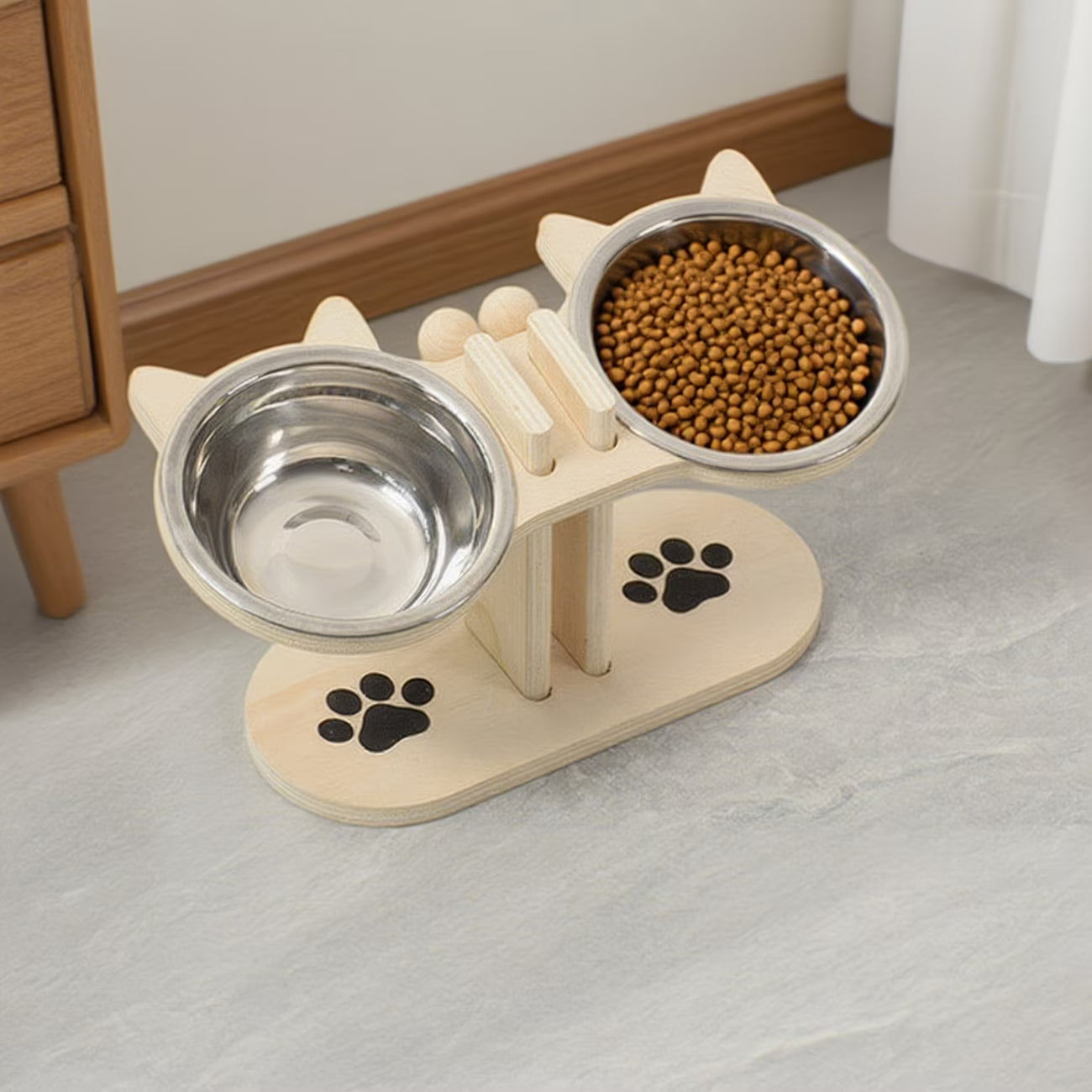Settet passer til både katter og hunder, og treverket gir et stilrent uttrykk samtidig som det er stabilt. Skålene er enkle å ta ut og rengjøre, og leveres i tre lekre farger.